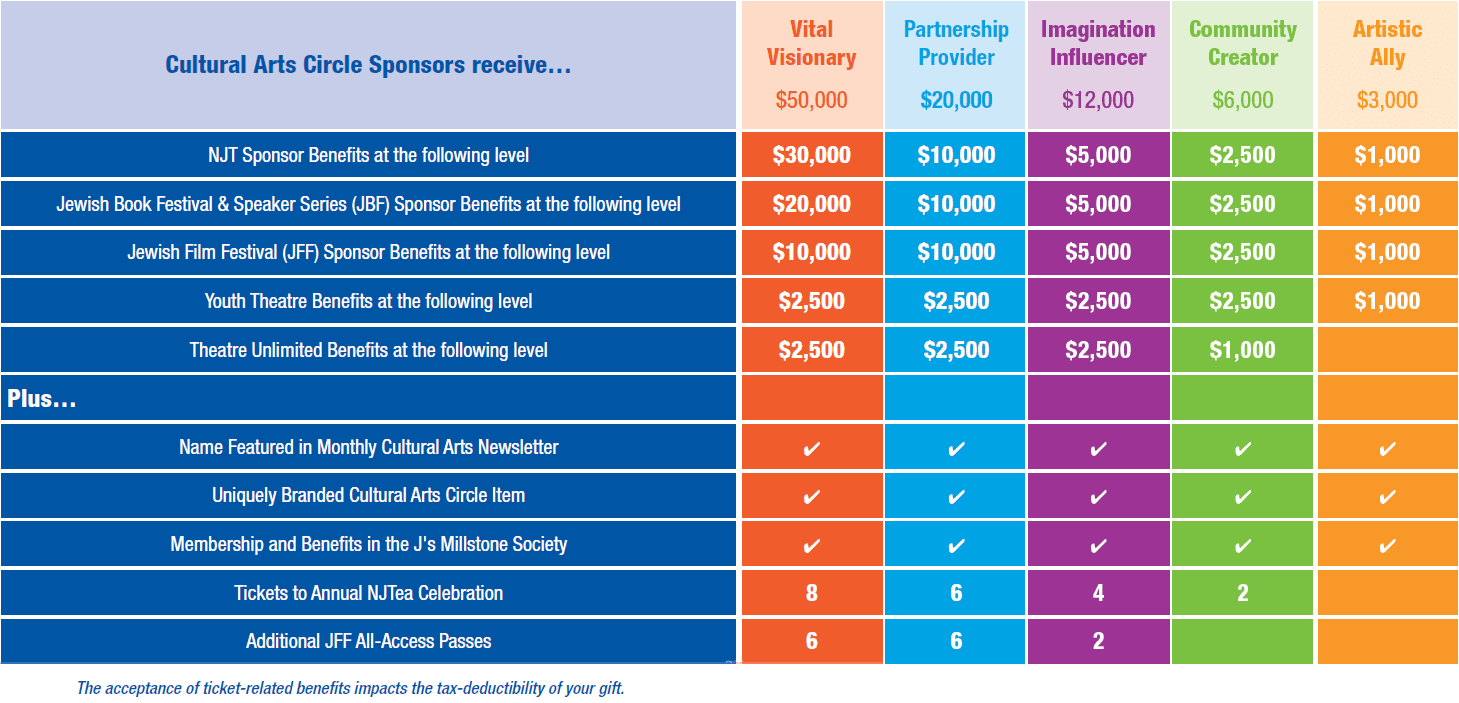 When you bundle your giving, you can support all of the J's Cultural Arts programming at one time! You can find additional program-specific benefits outlined in our 2026 Cultural Arts Circle Sponsorship Brochure.